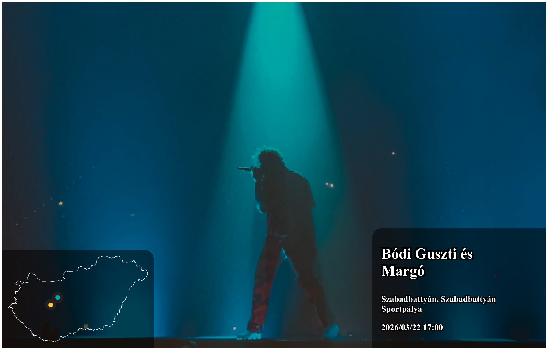 Az itt megjelenő eseményeket a produkció, vagy annak képviselője rögzítette. Az oldalon lévő információk valódiságáért a Koncertbooking.com ennek kapcsán felelősséget nem tud vállalni. Indulás előtt ellenőrizze az adott település vagy eseményhelyszín oldalán is a rendezvény paramétereit.